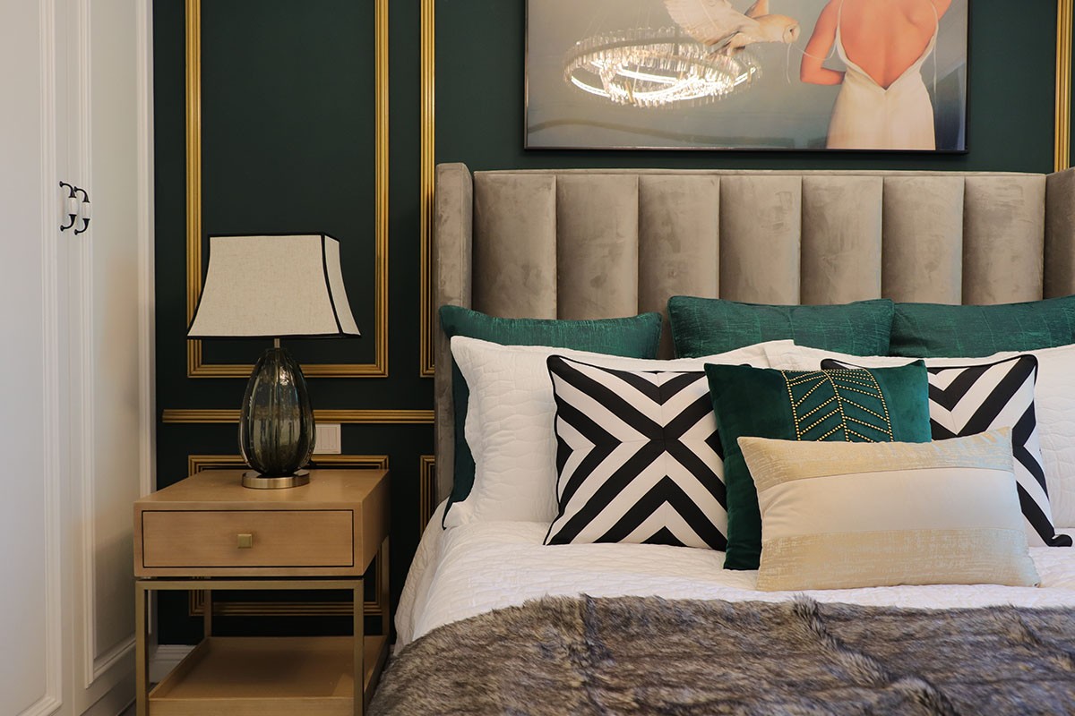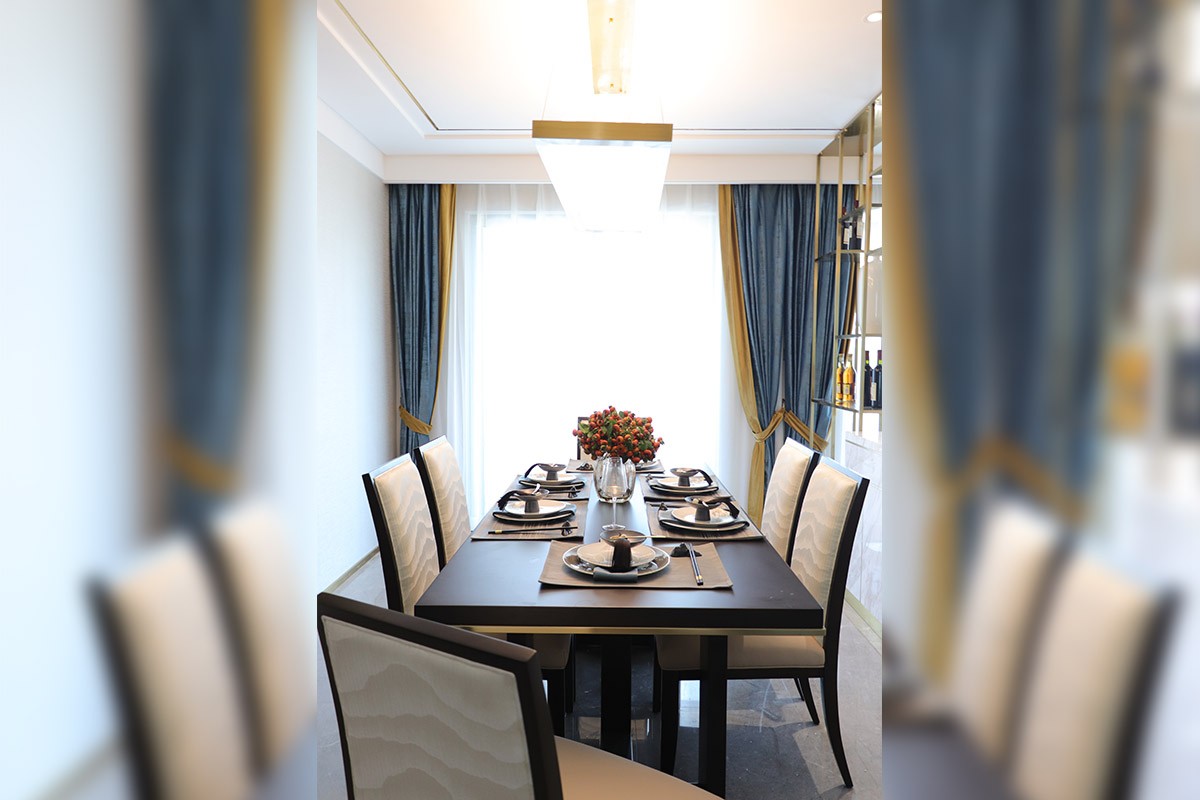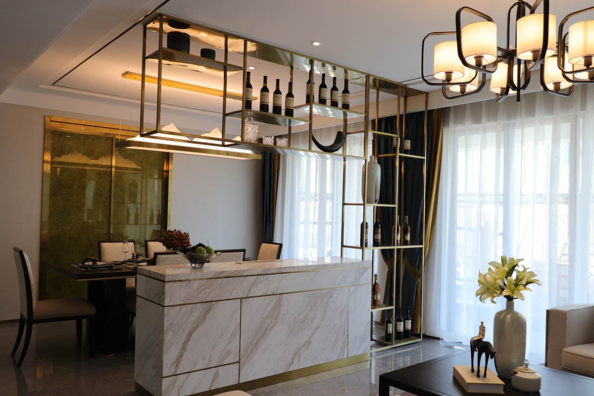 項目理念:本案設計師在新中式與現代輕奢風相結合的前提下,對于新中式風格的懷舊與創新感具有特別的理解,所以在設計效果上面采取了現代輕奢感強的不銹鋼線條搭配實木與大理石來呈現具有靈性的輕奢新中式,從充滿中式元素的燈飾到清雅氣韻的山水畫背景,隨處可見的墨綠色元素的詮釋,所有這些化為空間的底蘊,別有一番閑情雅韻。