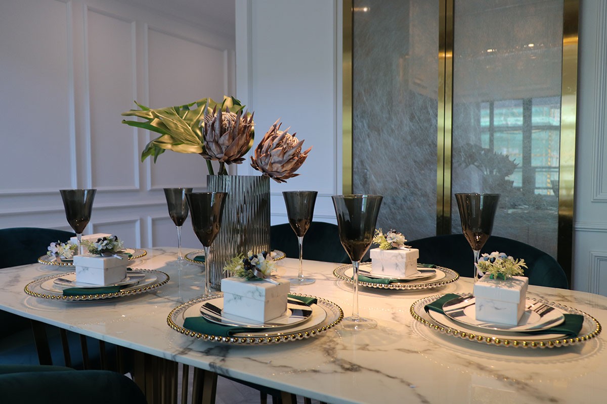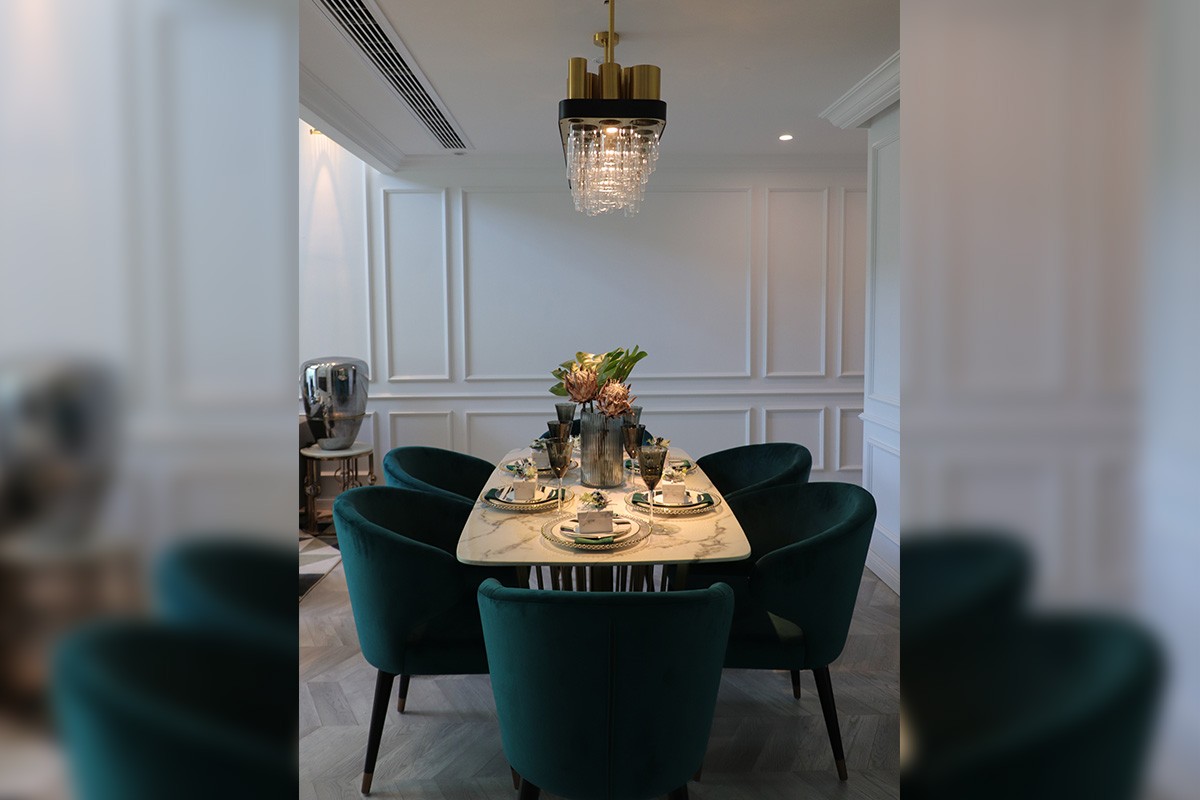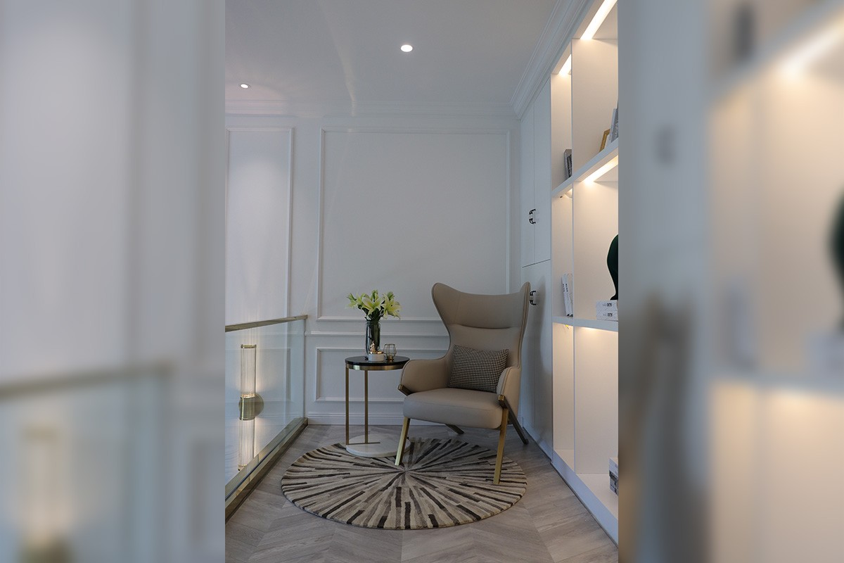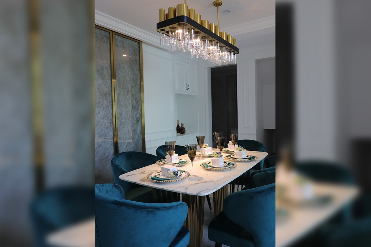 項目理念:本案設計師在新中式與現代輕奢風相結合的前提下,對于新中式風格的懷舊與創新感具有特別的理解,所以在設計效果上面采取了現代輕奢感強的不銹鋼線條搭配實木與大理石來呈現具有靈性的輕奢新中式,從充滿中式元素的燈飾到清雅氣韻的山水畫背景,隨處可見的墨綠色元素的詮釋,所有這些化為空間的底蘊,別有一番閑情雅韻。