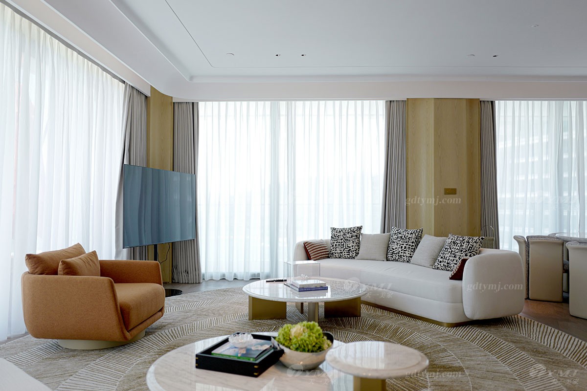 本案為現(xiàn)代極簡奢華設(shè)計(jì)風(fēng)格,以白色,原木色為主基調(diào),以灰、藍(lán)、紅、咖啡棕等色調(diào)為輔,作為點(diǎn)綴裝飾,以增加空間的層次感和活力,并融入了深圳特有的海洋文化元素;墻面裝飾大量運(yùn)用原木色波浪木紋、弧形轉(zhuǎn)角造型;獨(dú)特的懸浮式吊頂及采用無主燈設(shè)計(jì),簡約又時(shí)尚;簡潔流暢的線條設(shè)計(jì),純粹的色彩搭配,大理石、金屬等材質(zhì)的運(yùn)用以及細(xì)節(jié)的工藝處理,無不彰顯極簡風(fēng)格的精髓,注重功能實(shí)用性的同時(shí),追求形態(tài)與功能的完美結(jié)合,整體在視覺感受上體現(xiàn)了一種清新自然,舒適雅奢的氛圍,與酒店的整體設(shè)計(jì)完美融合。