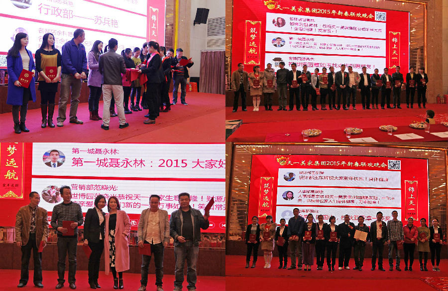 “錦上天一,筑夢遠航”——天一美家集團2015年年會于2月8日下午18點成功舉辦,本屆年會共分為總經理致辭、2014年度忠誠員工、優秀員工頒獎盛典、及節目表 演、微信大屏幕抽獎、獲獎節目頒獎、蒙古游頒獎等環節,別墅家具定制年會歷時四小時有余,整場大會亮點迭出高潮迭起,員工歡聲笑語不斷,熱烈掌聲不息。