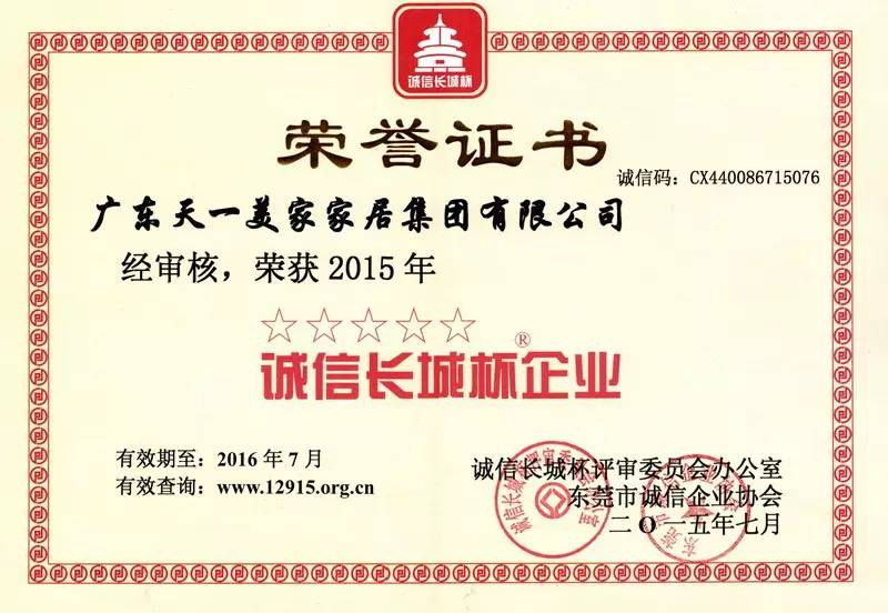近日,廣東天一美家家居集團有限公司榮獲由東莞誠信企業協會、誠信長城杯評審委員會辦公室、中企評協信用評級中心授予的“誠信長城杯”企業稱號、證書和牌匾。
